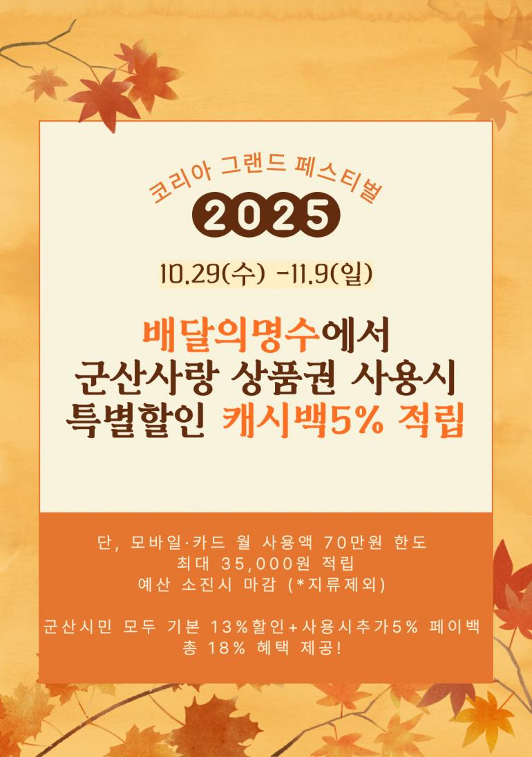 배달의명수에서 군산사랑상품권 사용시 특별할인 캐시백5% 적립